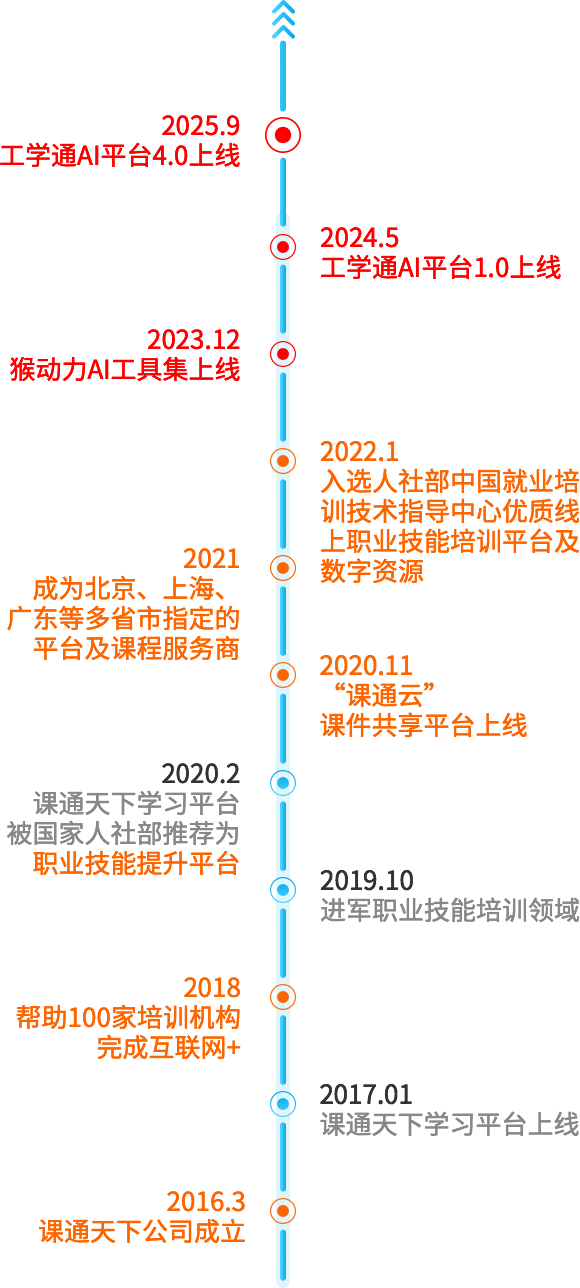作为国家高新技术企业,课通天下受到国家人社部及多个省市的推荐或指定,成为“线上职业技能培训及数字资源”平台机构。公司自主研发的“课通云”课件共享平台已成功整合400+职业技能工种等级课程及1000+企业通用课程,所服务的客户涵盖了政府职业技能提升管理平台、大型企业、技工院校、学习平台厂商、职业培训机构等多个领域。
